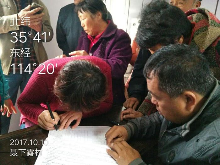 钜桥镇聂下雾村,投保农户核对自己身份信息、地块面积,并在投保明细表上签字确认。