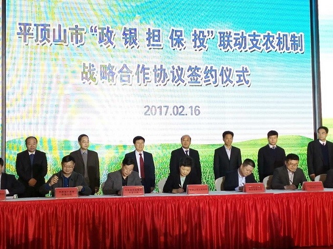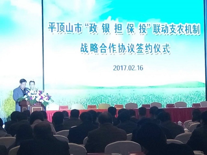 2017年2月16日上午,平顶山市政府举办“政、银、担、保、投”联动支农机制战略合作协议签约仪式,河南省财政厅庞学孟副厅长、农业处处长郑新建、168飞艇官网直播党委书记、董事长毕治军、河南省农开公司刘向东副总经理、农信担保公司刁玉新董事长、中原资产管理公司岳胜利总裁、平顶山市胡荃书记、周斌市长、黄祥利常务副市长、冯晓仙副市长,政府办,市委农办,金融办,扶贫办等各市直部门主要领导,及市辖县主要领导和分管农业的副县长、农业局,财政局,林业局,畜牧局等相关部门主要负责人出席了签约仪式。