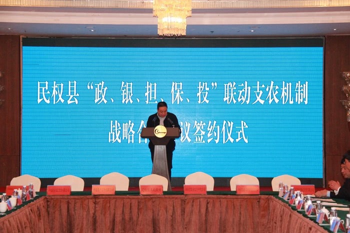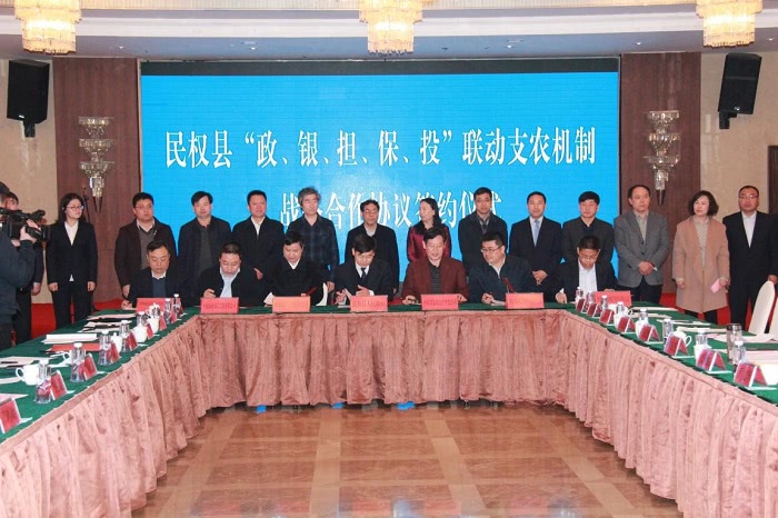 2017年3月30日上午,民权县“政、银、担、保、投”联动支农机制战略合作协议签约仪式在民权县举行。省财政厅副厅长张中亮,商丘市委统战部部长岳文华、商丘市财政局局长王全国,中原农险公司、中原资产管理公司、省农开公司、省农担公司、省豫资公司、省扶贫搬迁公司、省邮储银行主要负责人,民权县县长张团结以及各县直部门、各乡镇、金融机构主要负责人参加签字仪式。