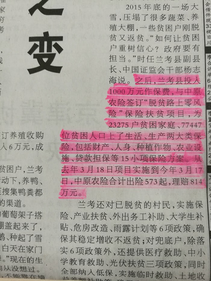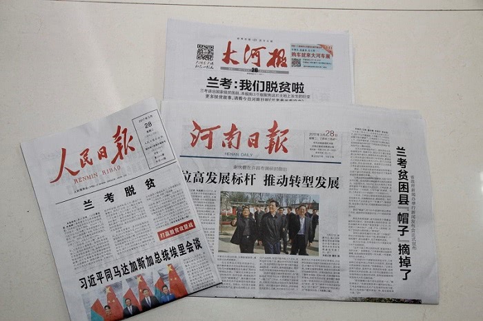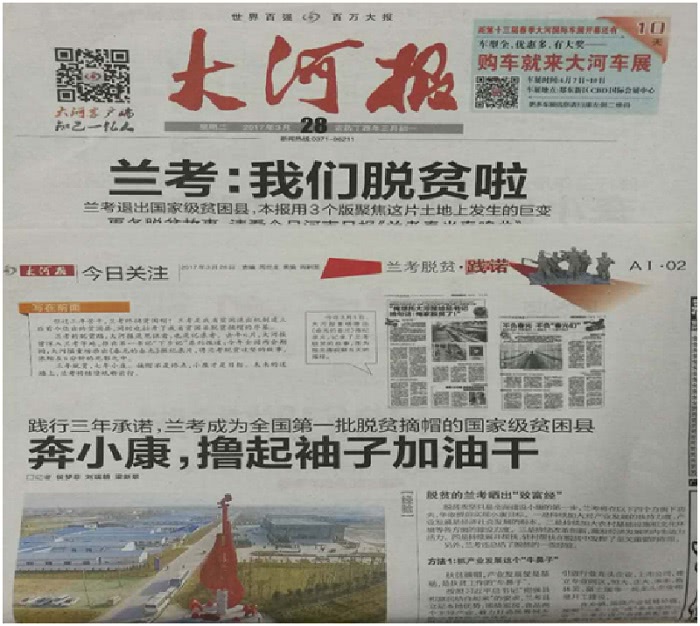 兰考脱贫这个关键词今日同时占据了人民日报、河南日报、大河报等多家主流媒体的头版位置,正式宣布兰考县摘掉了贫困县的“帽子”。在多家媒体不同角度的报道中,却同时都出现了"168飞艇官网直播"的名字。公司与兰考县政府合作的“脱贫路上零风险”项目在兰考全县脱贫攻坚中的贡献由此可见一斑。