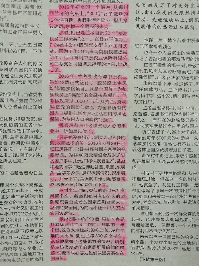 河南日报3月28日要闻2版,名为《兰考春光奏鸣曲》的整版专题报道中利用大篇幅叙述了公司兰考县支经理戴焱和查勘员李鑫在扶贫项目当中兢兢业业的工作形象及在扶贫工作中做出的贡献: