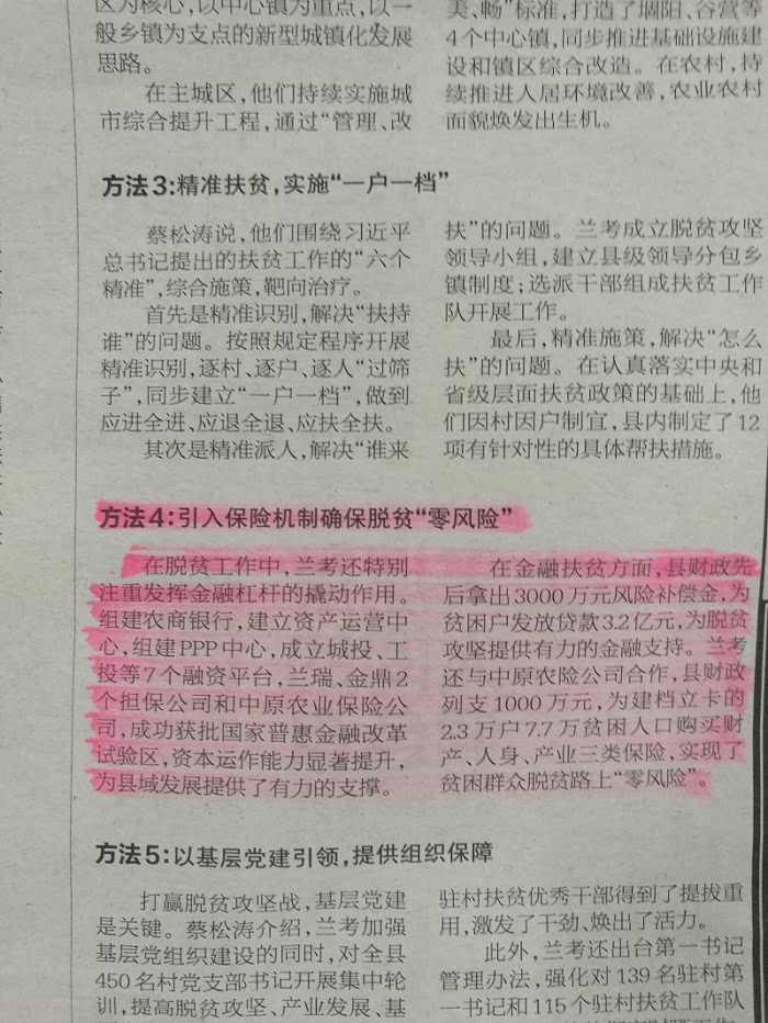 大河报3月28日2版今日关注,利用整个版面刊登了《奔小康,撸起袖子加油干》的主题报道,并将公司的“零风险”项目总结为脱贫的重要方法,列明了项目保障范围:
