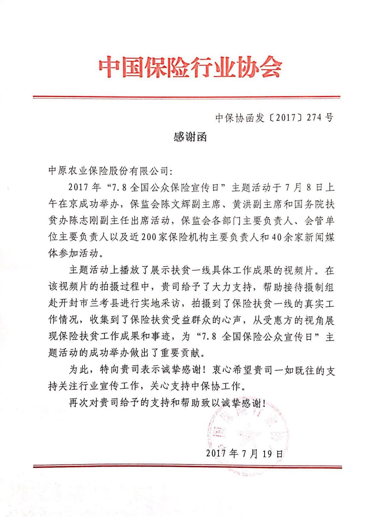 7月19日,中国保险行业协会给公司发来一封感谢函,感谢公司对行业宣传工作的一贯支持,对中保协工作的大力配合。