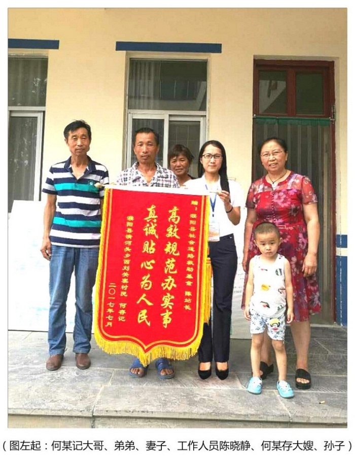 7月,一个烈日炎炎的上午,中原农险濮阳县服务站工作人员热情的接待了受助人何某记一家老小。何某记的妻子紧紧握着服务站工作人员的手说:“谢谢救助基金救了我丈夫的命,真想给你磕头表达我们的感激之情。”说着把一面印有“高效规范办实事 真诚贴心为人民”的锦旗送到服务站工作人员手中。