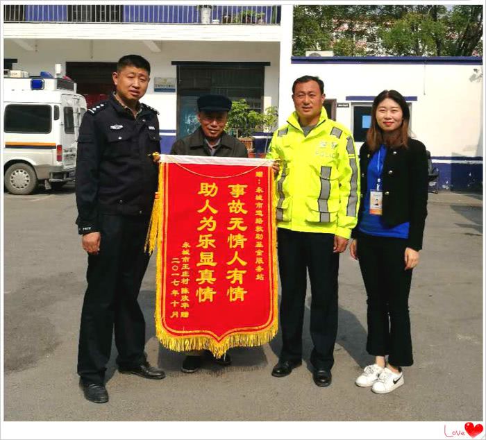 10月27日早上,陈某华的家属王先生代表全家来到公司永城县服务站,并将一面印有“事故无情人有情 助人为乐显真情”的锦旗送到了交警和服务站工作人员手中,感恩救助基金的及时救助,感谢工作人员的无私帮助。