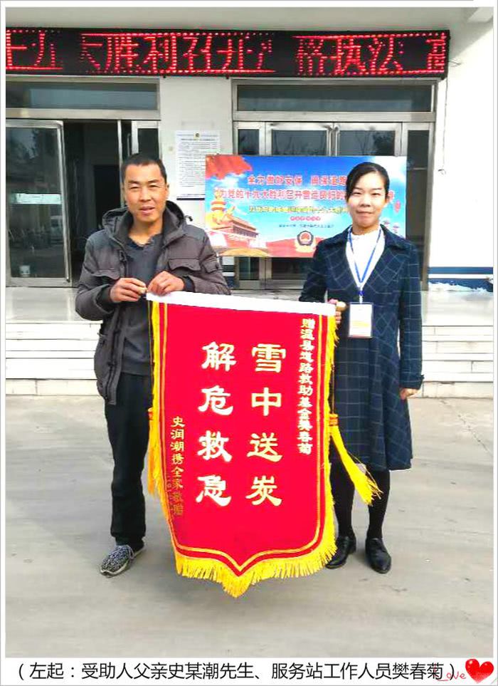 11月1日清晨,基金受助人史某辉的父亲前往中原农险温县救助基金服务站,把一面印有“雪中送炭 解危救急”的锦旗送到工作人员手中,感谢救助基金为其儿子垫付34903.63元的抢救费用,同时感谢服务站工作人员的热情帮助。