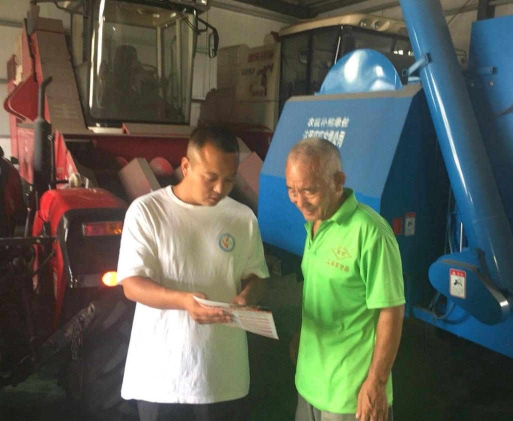 此次联合收割机在田地作业过程中造成人伤事件,是济源市服务站垫付的本地区首笔农机伤人案件,为防止此类案件发生,济源市服务站工作人员王骁、史小虎冒着炎热天气前往田间发送道路救助基金宣传册,并向农民群众介绍救助基金政策,耐心解答群众提出的问题,用实际行动保障群众生命安全。">
