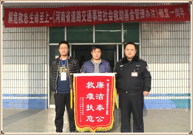 交通事故猛于虎,生命安全大于天。2016年12月23日,受助人郑某的儿子将一面印有“廉洁奉公 救难扶危”的锦旗送到中原农险滑县道路救助基金服务站,感谢基金让他们一家感受到政府的温暖。