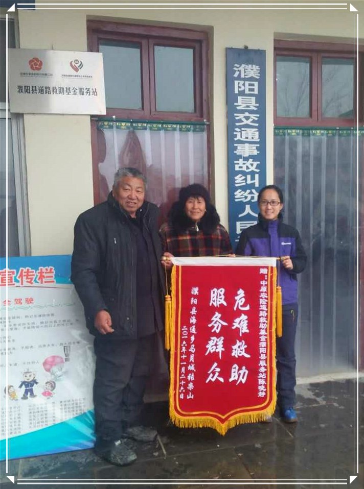 2016年12月26日,在这寒冷的天气里,中原农险濮阳县道路救助基金服务站却温暖如春。受助人张某的亲属冒着雨雪将一面印有“危难救助 服务群众”的锦旗送到服务站,对服务站工作人员的敬业精神赞不绝口。