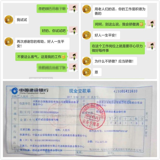 2017年2月21日,中原农险孟州市服务站收到一笔救助基金垫付款。