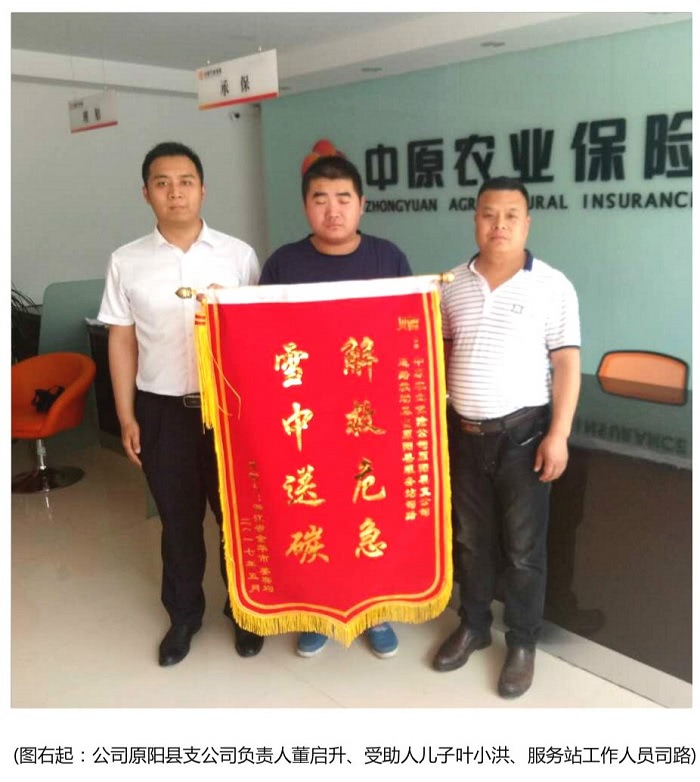 5月18日,基金受助人姜女士的儿子来到中原农险原阳县支公司,将一面锦旗亲自送到支公司负责人董启升及服务站工作人员司路手中。感谢救助基金挽救了他妈妈的生命。