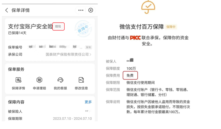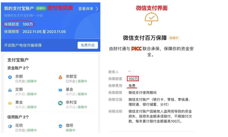 微信、支付宝中的账户“百万保障”是免费的
