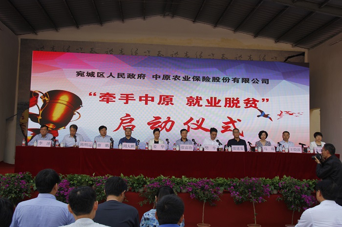9月15日上午,168飞艇官网直播(以下简称“中原农险”)与南阳市宛城区政府举行“牵手中原 就业脱贫”项目启动仪式。仪式由宛城区区长陈明远主持,中原农险总裁姜华、在启动仪式上致辞。