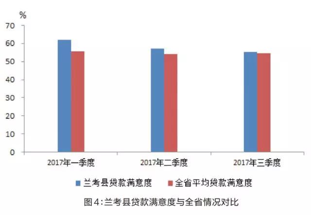 4.满意度指数不断提升,金融服务持续改善。三季度末,兰考县普惠金融满意度指数为0.18,较2015年末提升0.04,全省排名提升9位;贷款满意度和保险满意度的边界距离得分分别为0.19、0.16;农户、小微企业贷款满意度为55.4%,高于全省平均水平1个百分点。