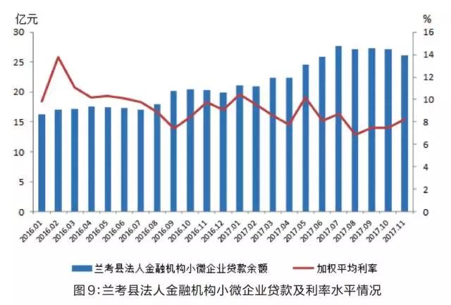 4.薄弱领域利率下行,定向发力效应初显。2017年,整体利率水平趋于稳定,涉农、小微企业贷款利率水平下行。11月末,兰考县法人金融机构小微企业贷款加权平均利率为8.2%,同比下降2个百分点。再贷款、再贴现、定向降准、财税扶持政策效应已经显现。