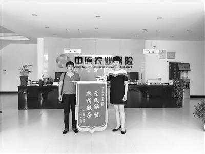 6月21日上午,获嘉县太山村贫困户周某的姐姐周彩兰将一面写有“为民解忧 热情服务”的锦旗送到中原农业保险获嘉县营销服务部办公室(如图),紧握工作人员的手说:“感谢获嘉县委、县政府和中原农业保险,让我们在最无助的时候看到了生活下去的希望。”