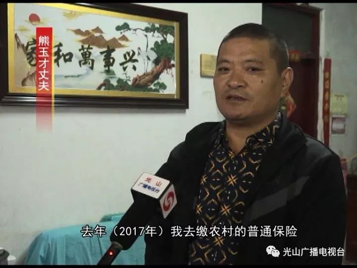 熊玉才丈夫:“去年2017年我去交农村的普通保险,自愿交了35块钱,现在党的政策非常的好,给我们现在补了10多万了,16万了,感谢党的好政策,谢谢各位领导和中原保险公司的领导在我最困难的时候送来的温暖。”