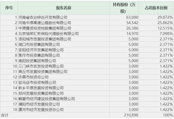 按照中原农险原计划拟发行19亿股的计算,本次认购完成后,中原高速继续持有中原农险18.18%的股份。但由于中原农险今年调整了增资规模,中原高速的持股比例随之变更为25.86%。