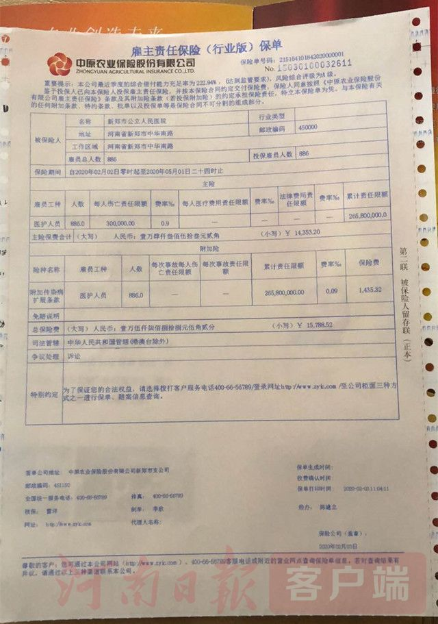 据悉,此次中原农险公司捐赠的保险主要承保医护及相关医护人员在日常工作、上下班途中遭受意外,以及在新型冠状病毒感染的肺炎防护与救治过程中受到伤害导致死亡、残疾,每人保额30万元。