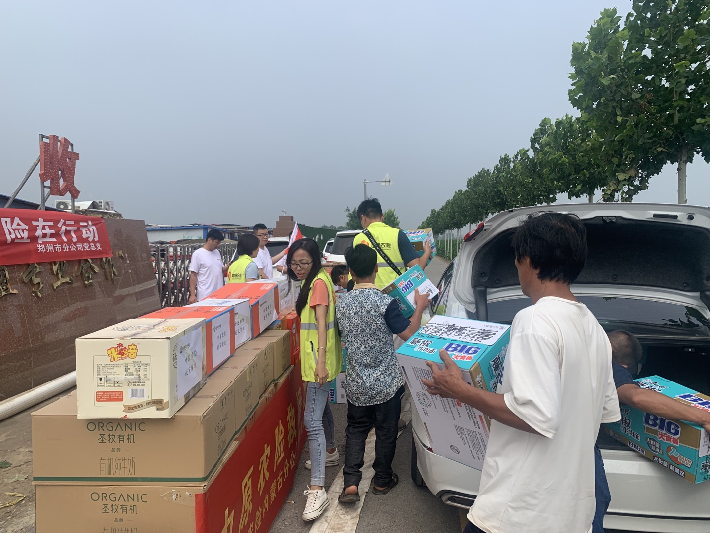 了解到部分灾区群众急缺食品、药品及饮用水的情况,中原农险各基层党支部与党员自发组织、自发援助,第一时间成立物资援助应急小组,在内蒙古、河南两地协调方便食品、牛奶、纯净水等急缺物资900余箱,并分三个批次驰援灾区,同时加急采购应对腹泻、发热、外伤感染的灾后药品20余种10余箱配套发放。