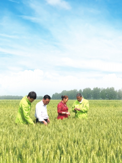 ④中原农险工作人员和农业专家在进行夏粮查勘。