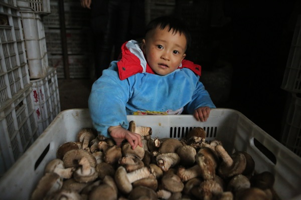 大人在忙着分拣香菇,一名儿童也趴在筐上翻弄香菇。